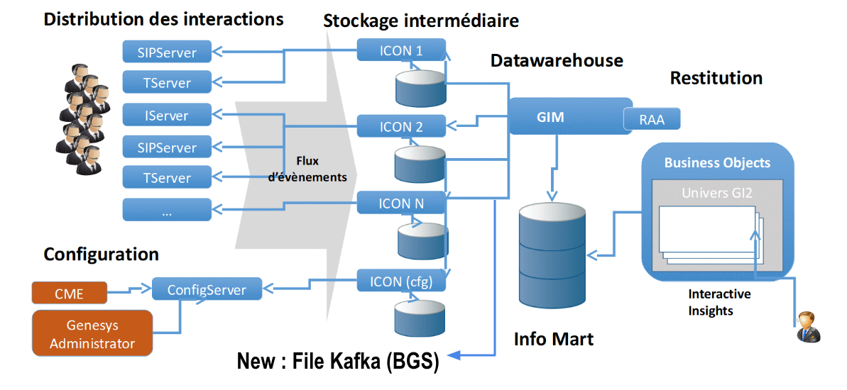 Cette activité intense va générer des événements qui vont être collectés par Infomart. Cette étape de récupération de la donnée brute s’appuie sur l’Interaction Concentrator (ICON). L’ICON est un composant connecté aux autres composants de la solution. Dans la plupart des déploiements Genesys Engage, il y a plusieurs ICON (rôle, robustesse, notamment en lien avec l’architecture). A l’issue de cette étape, Infomart va récupérer, fusionner et restituer ce flux d’informations dans une base de données relationnelles.