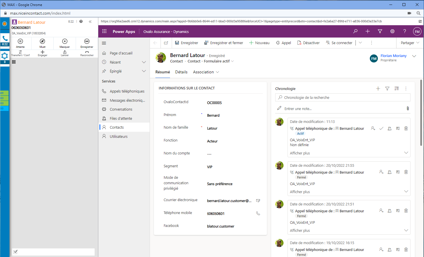 Ci-dessous le Bandeau Nice MAX intégré au CRM Dynamics :
