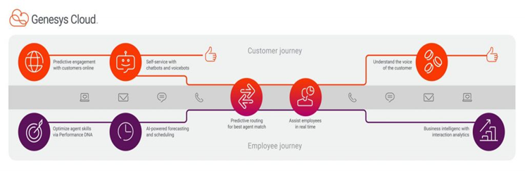 Au cœur de sa stratégie de développement, Genesys Cloud CX propose en 2021 plusieurs fonctionnalités axées sur l’IA et de l’automatisation, et cela via une planification automatique, des chatbot et callbot, du web engagement, du routage prédictif, de l’assistance agent en temps réel…