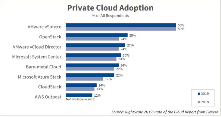 Concernant sa répartition sur le marché, OpenStack est de plus en plus utilisé pour créer des cloud publics et privés par les entreprises. De nombreux projets sont créés et obtiennent des contributions de la part des développeurs.